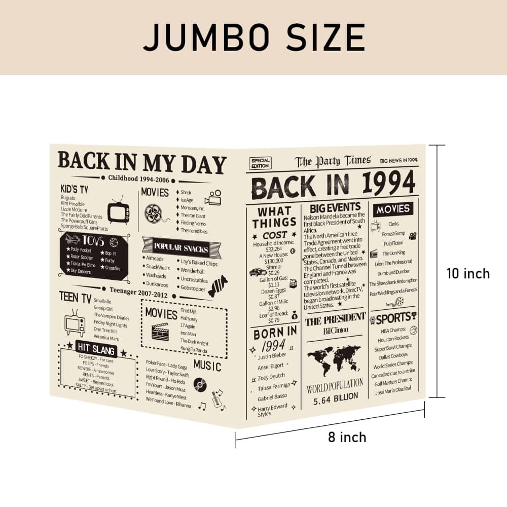 Take a look back in 1994, celebrate a milestone birthday/anniversary with this card brimming full of fun facts from 1994. It’s also a perfect gift or decoration for 30th birthday party, wedding anniversary or class reunion.