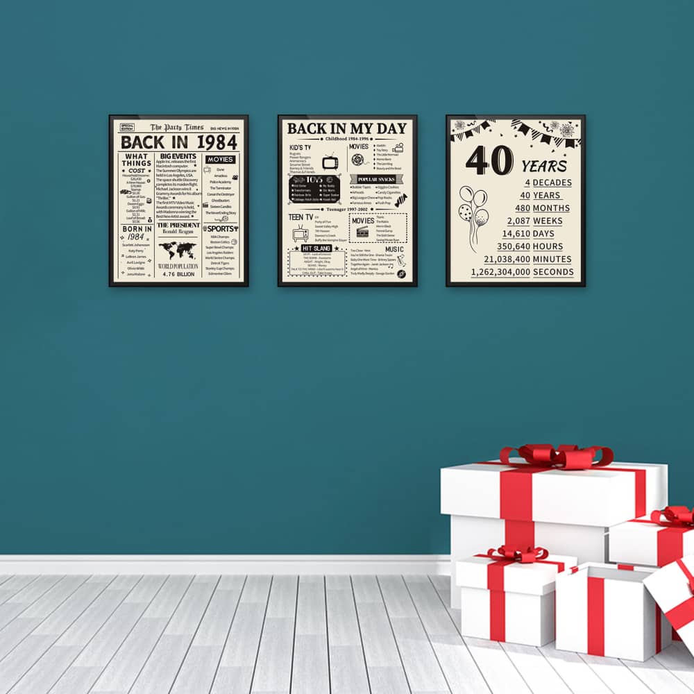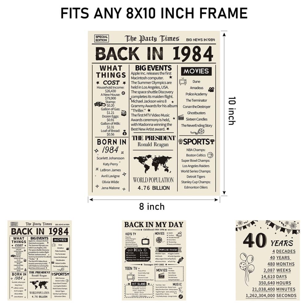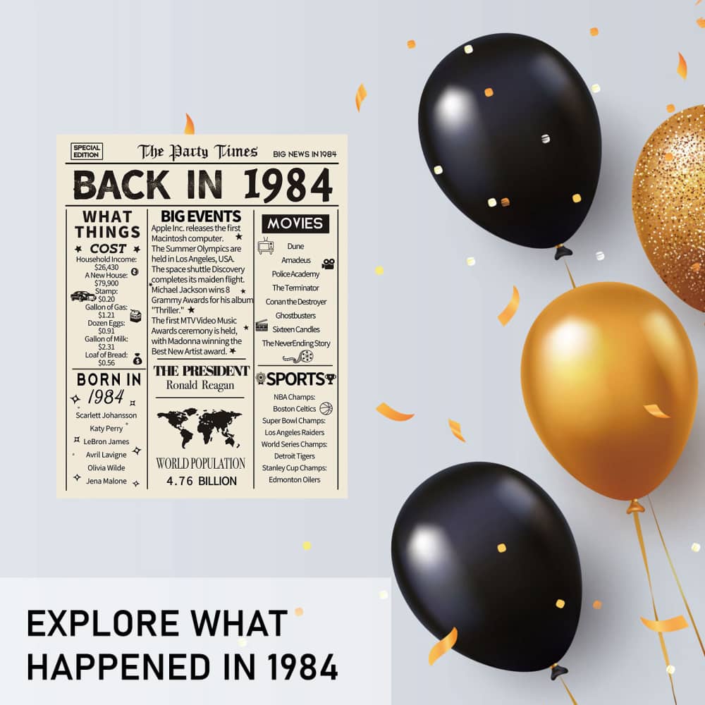 Take a look back in 1984, celebrate a milestone birthday/anniversary with this poster brimming full of fun facts from 1984. It’s also a perfect gift or decoration for 40th birthday party, wedding anniversary or class reunion.