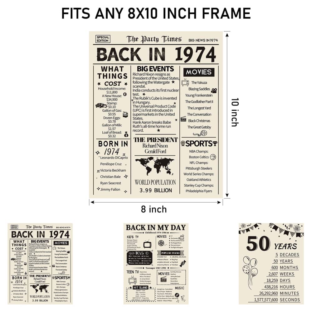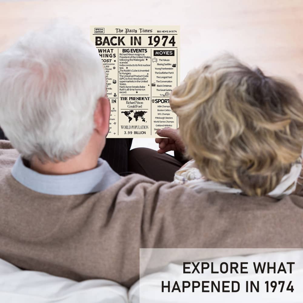 Take a look back in 1974, celebrate a milestone birthday/anniversary with this poster brimming full of fun facts from 1974. It’s also a perfect gift or decoration for 50th birthday party, wedding anniversary or class reunion.