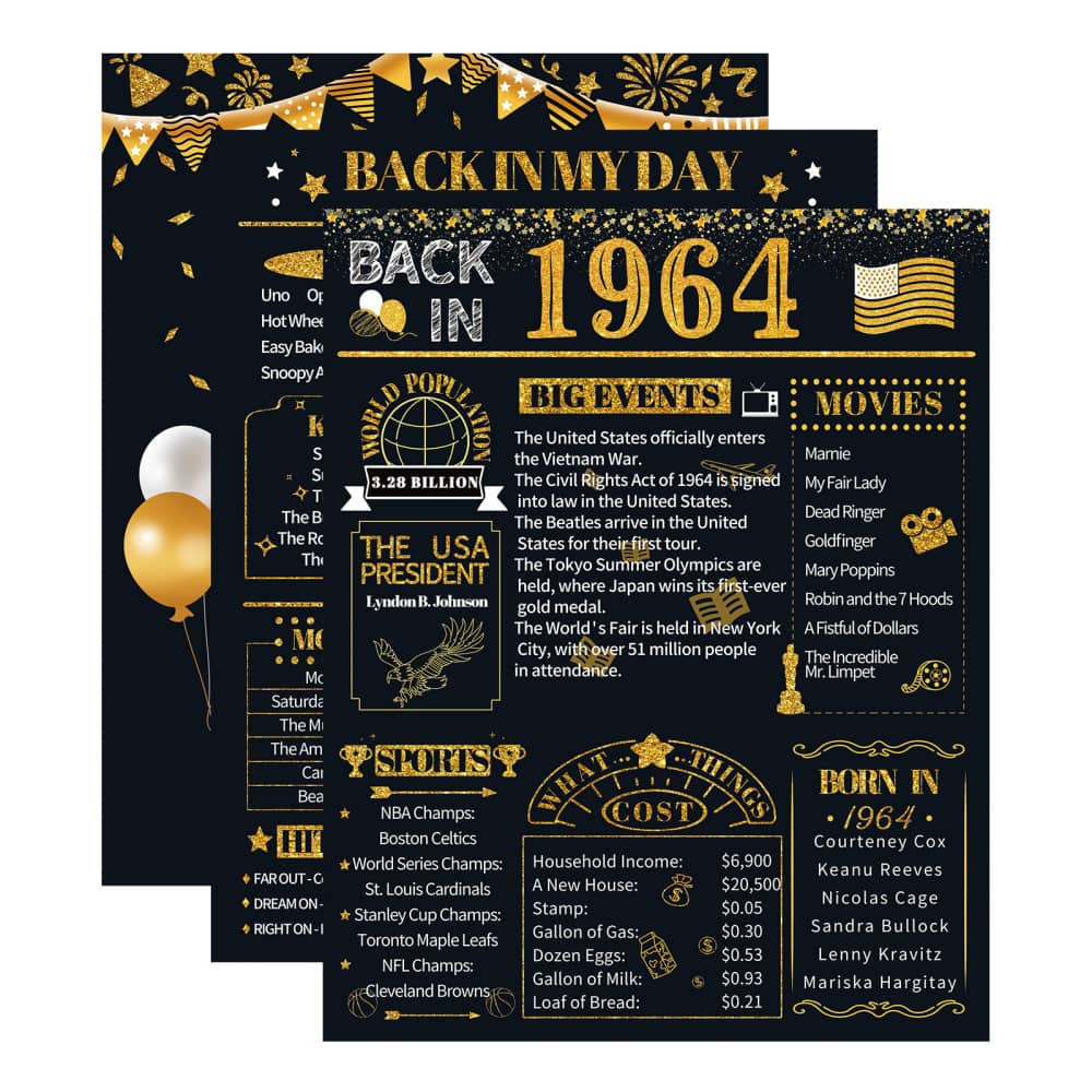 Take a look back in 1964, celebrate a milestone birthday/anniversary with this poster brimming full of fun facts from 1964. It’s also a perfect gift or decoration for 60th birthday party, wedding anniversary or class reunion.