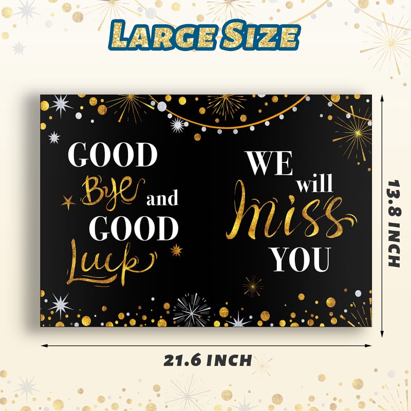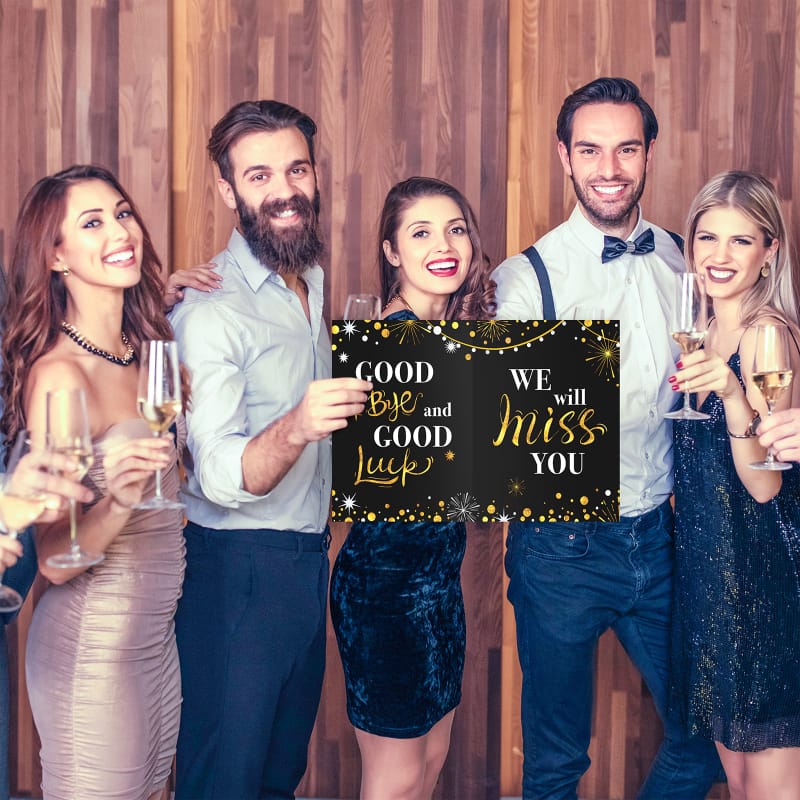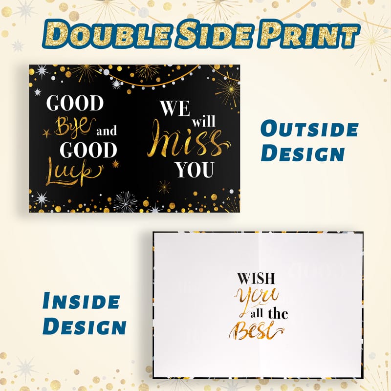 【Special Design】: Farewell party decorations card is design in black gold color with the caption – Good Bye and Good Luck, We Will Miss You and inner page message – Wish You All the Best. This leaving card is perfect for farewell and going away party decorations.