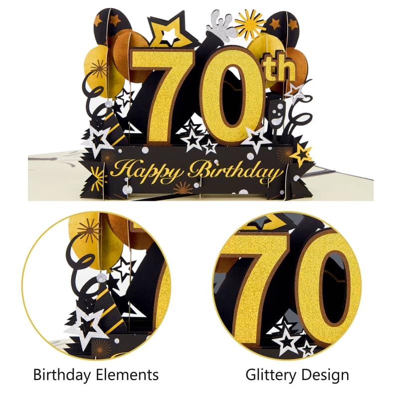 【Perfect Gift】: This 70 birthday pop up card would be a great gift for women or men. Card folds flat and can be popped up of features “Happy 70th Birthday” with balloons, glitter stars. These stunning birthday elements will sure to suprise the recipient on their special day.