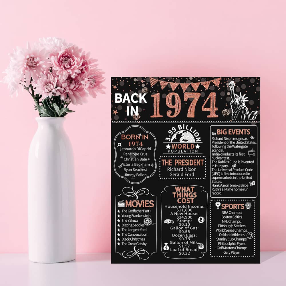 Take a look back in 1974, celebrate a milestone birthday/anniversary with this poster sign brimming full of fun facts from 1974. It’s also a perfect gift or decoration for 50th birthday party, wedding anniversary or class reunion.