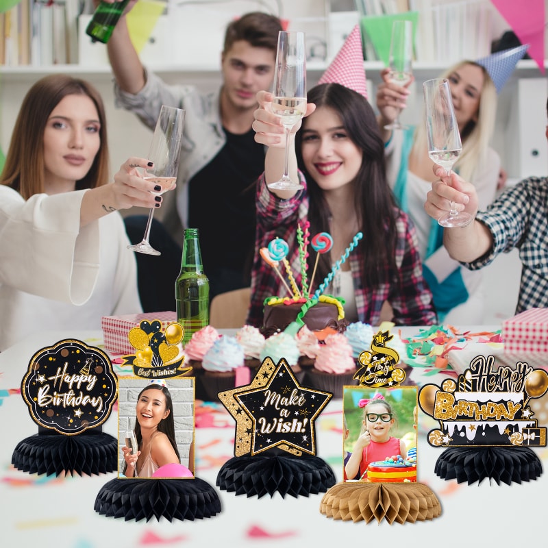 [Package Included] : You will get 9pcs black gold birthday photo honeycomb centerpieces with 9 honeycombs, paired with 40 bonding points for easy photo pasting. These birthday centerpieces are so stylish and funny that make your birthday party more popular!