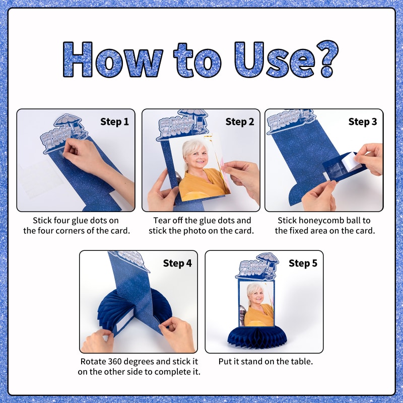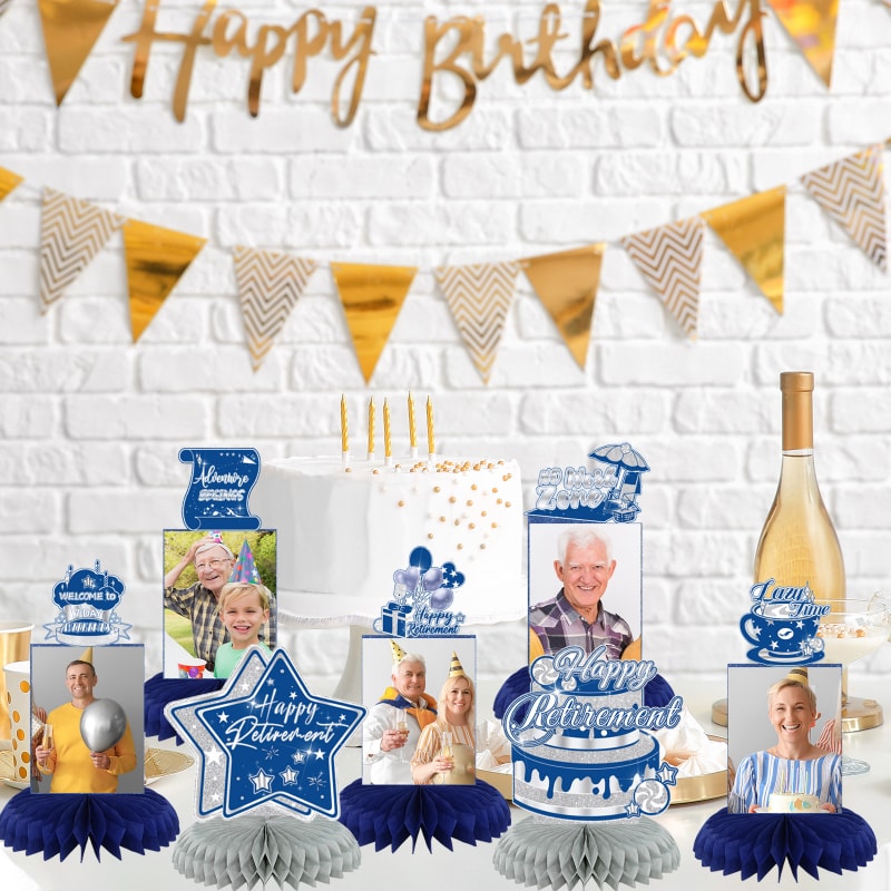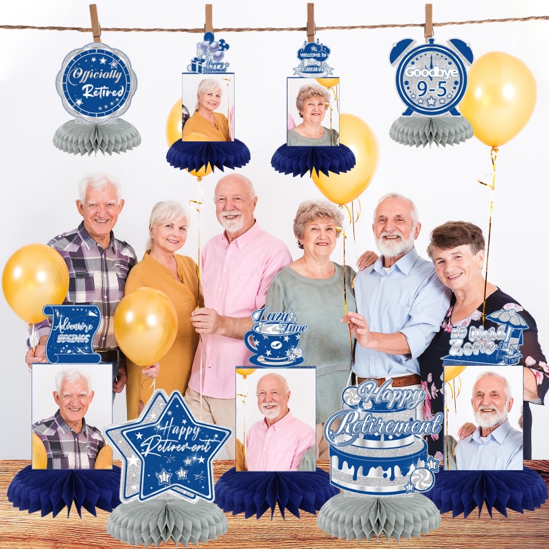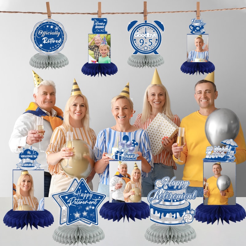 [Package Included] : You will get 9pcs blue silver retirement photo honeycomb centerpieces with 9 honeycombs, paired with 40 bonding points for easy photo pasting. These happy retirement centerpieces are so stylish and funny that make your party more popular!
