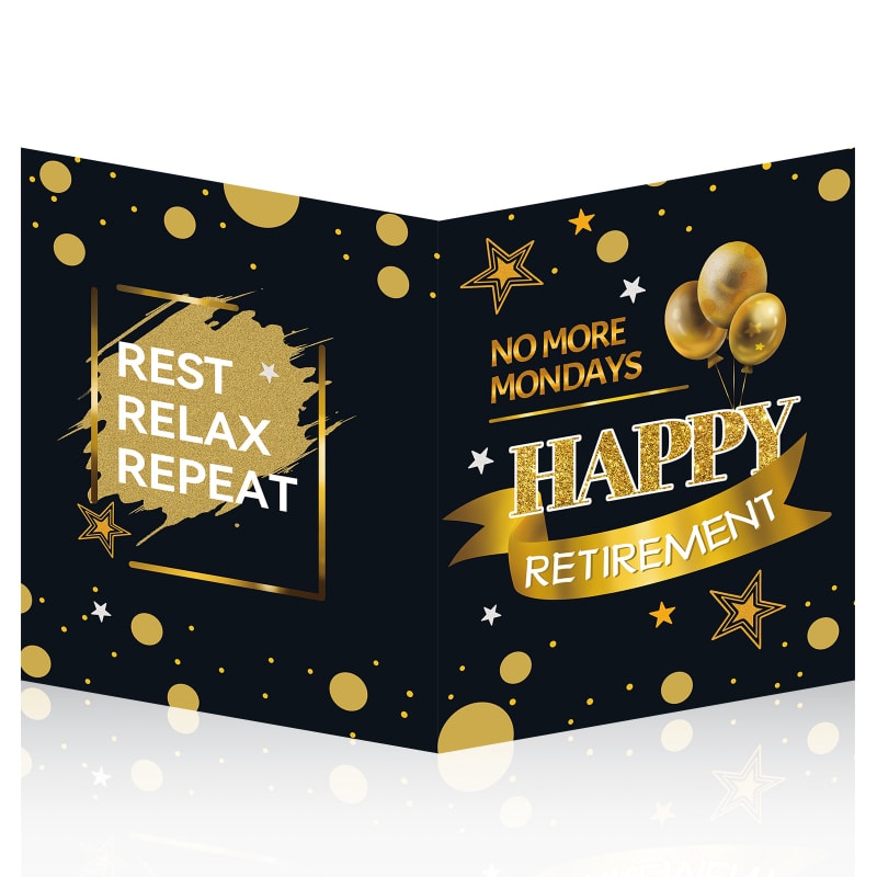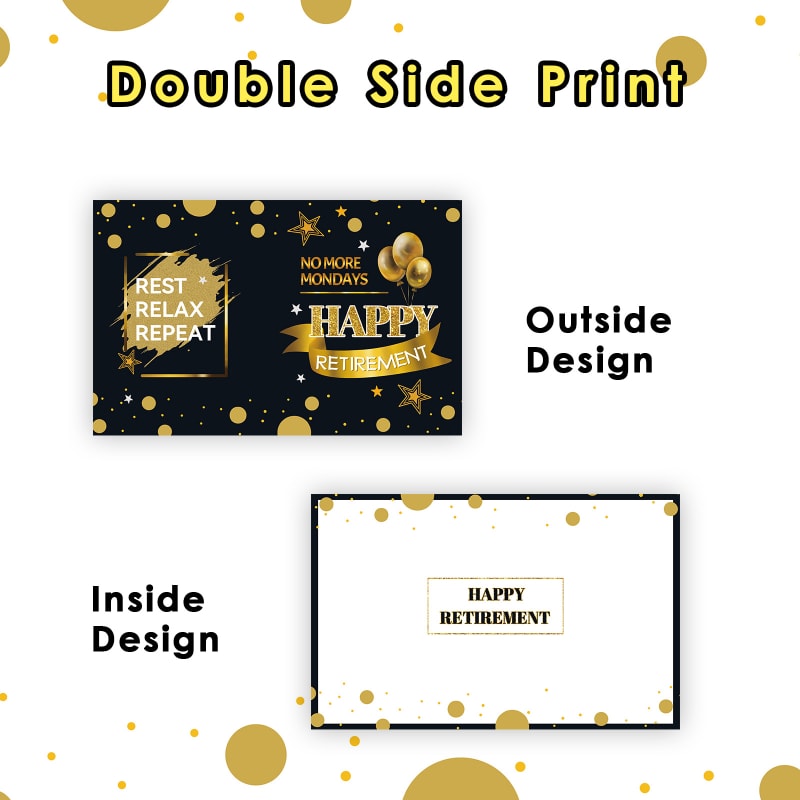 【Special Design】: Retirement party decorations card is design in Black Gold with the caption – Happy Retirement, No More Mondays, Rest Relax Repeat, and inner page message – Happy Retirement. This goodbye card is perfect for retirement and leaving party decorations.