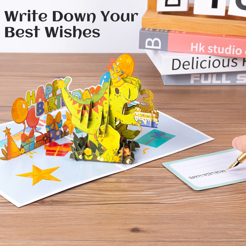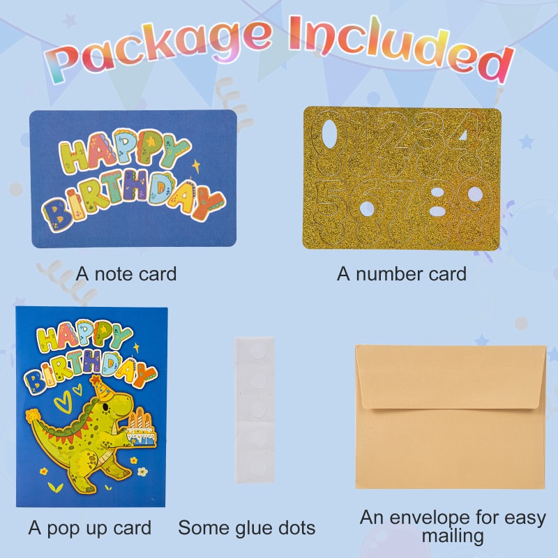 Package IncludedThis birthday card measures 6×8 inch when folded flat. Comes with an envelope, a dinosaur pop up card a little note card and a glitter number card. | DIY 0-9 NumbersYou can choose the number you need and stick it on the cake, then you can get an exclusive birthday card! | Little Note CardYou can write down your own heartfelt or great wishes, making this card to be a unique gift. |