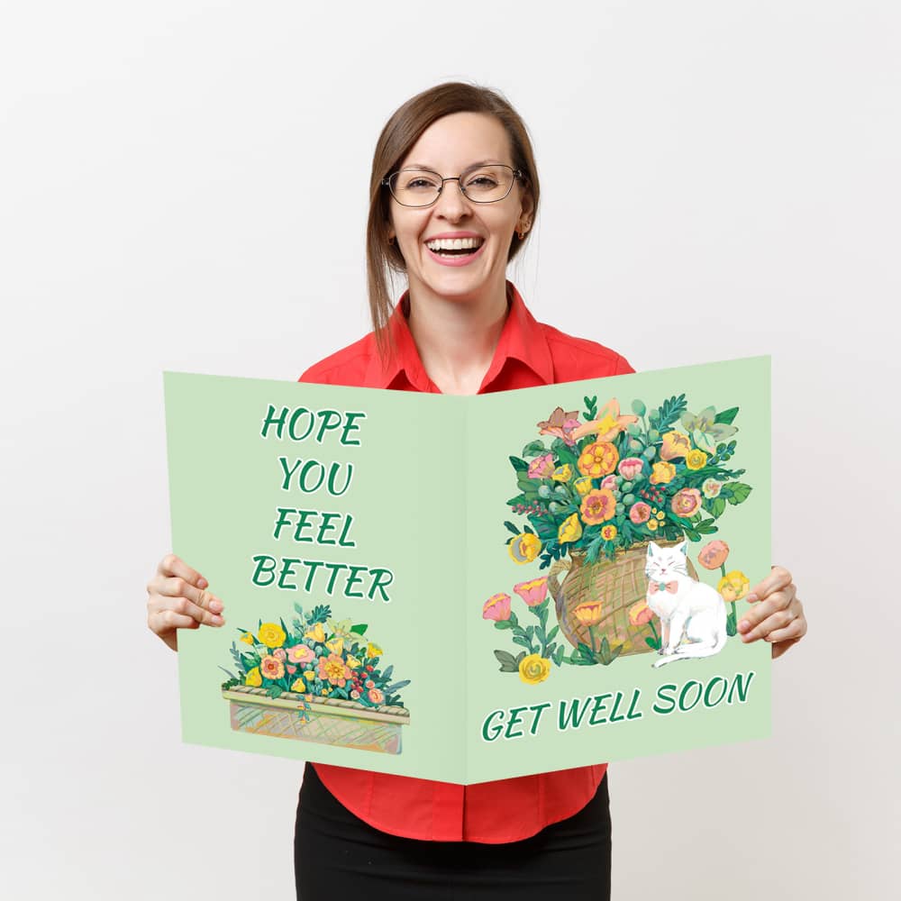【Lovely Design】: HOMANGA giant miss you card feature a lovely cat & floral themed design. With the caption – GET WELL SOON, HOPE YOU FEEL BETTER and inner page message – WISHING YOU A SPEEDY RECOVERY.