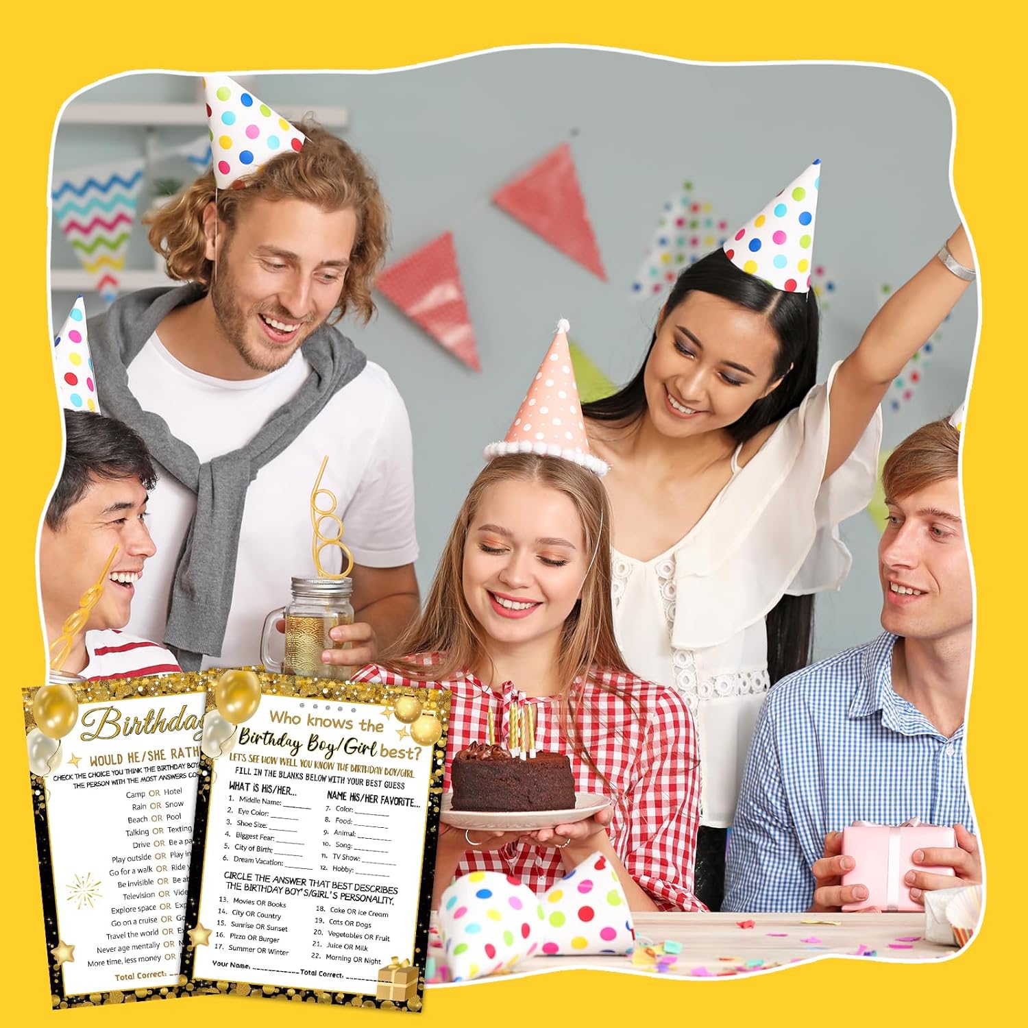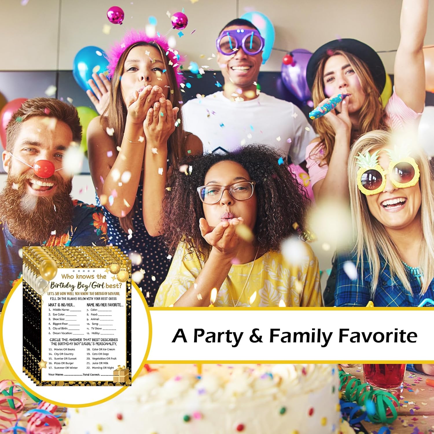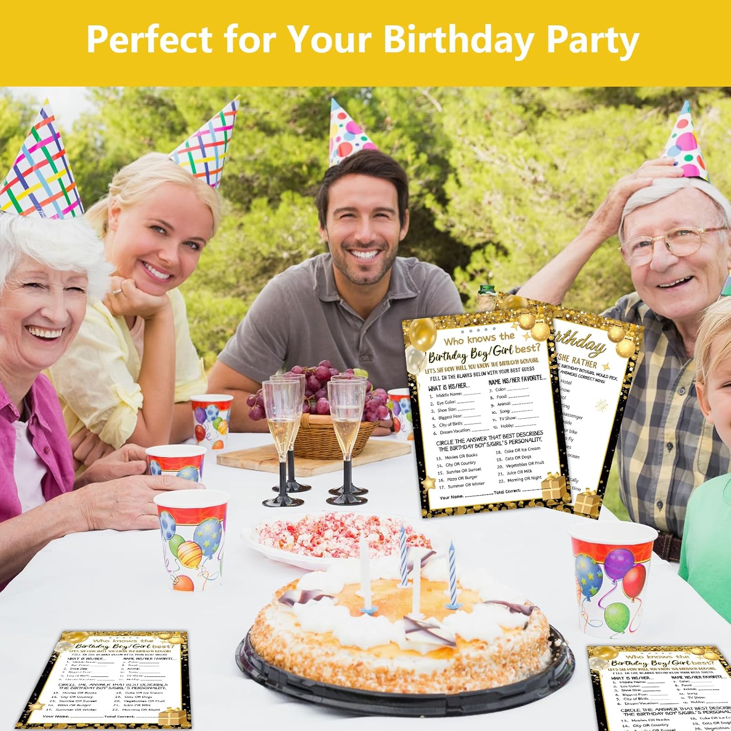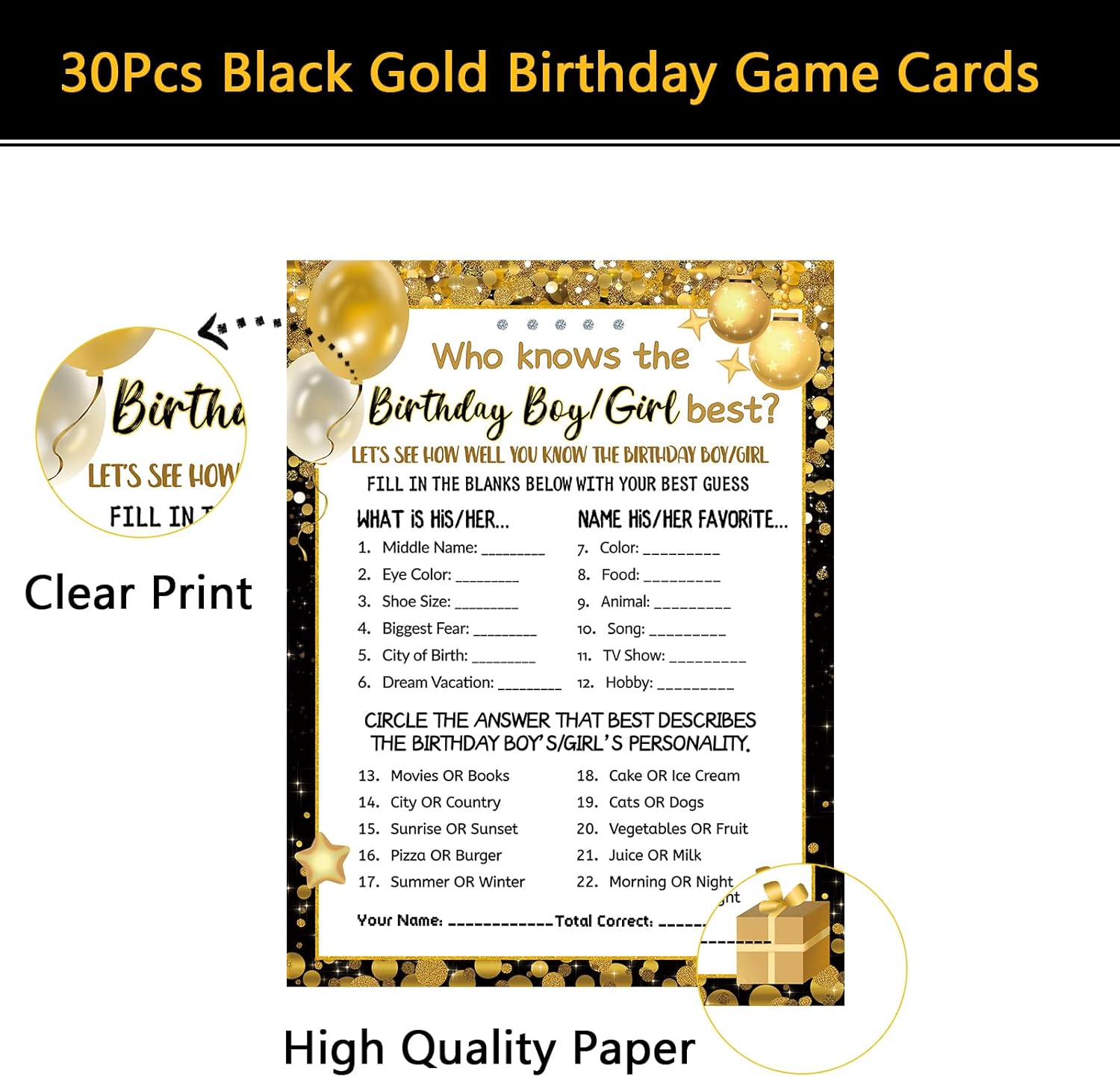 Exquisite Design – These cards feature a black gold theme with double-sided printing. They are adorned with party elements like balloons, stars, and gift boxes, with the theme “Who Knows the Birthday Boy or Girl Best?” Each card is designed to bring joy and laughter to your celebration.