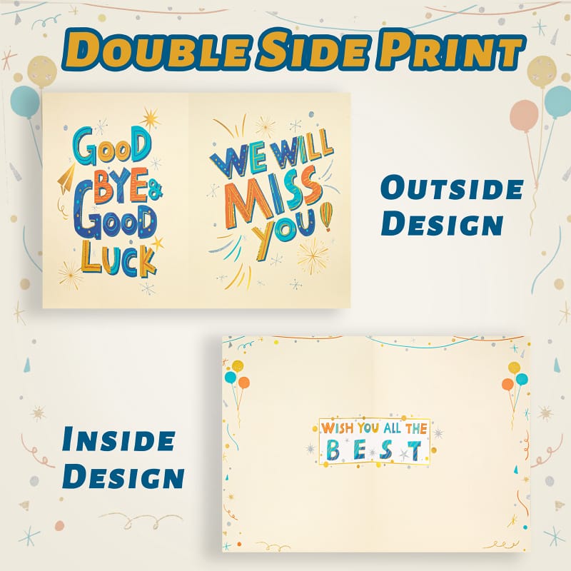 【Special Design】: Farewell party decorations card is design in bright muticolor with the caption – Good Bye and Good Luck, We Will Miss You and inner page message – Wish You All the Best. This leaving card is perfect for farewell and going away party decorations.